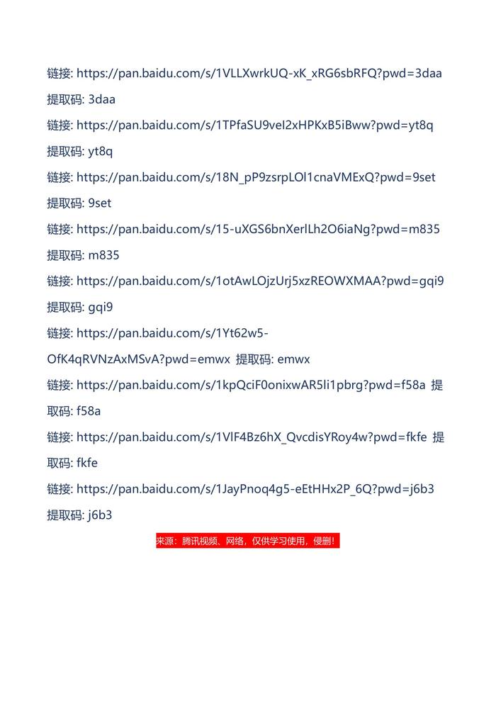 资料预览如下:ABC安全提醒:资料超50MB星球+小程序无法上传,故用百度云盘方式分享,以下链接内容均相同,选一下载即可!下载地址见本文档第2页: 链接: https://pan.baidu.com/s/1VLLXwrkUQ-xK_xRG6sbRFQ?pwd=3daa 提取码: 3daa 链接: https://pan.baidu.com/s/1TPfaSU9veI2xHPKxB5iBww?pwd=yt8q 提取码: yt8q 链接: https://pan.baidu.com/s/18N_pP9zsrpLOl1cnaVMExQ?pwd=9set 提取码: 9set 链接: https://pan.baidu.com/s/15-uXGS6bnXerlLh2O6iaNg?pwd=m835 提取码: m835 链接: https://pan.baidu.com/s/1otAwLOjzUrj5xzREOWXMAA?pwd=gqi9 提取码: gqi9 链接: https://pan.baidu.com/s/1Yt62w5-OfK4qRVNzAxMSvA?pwd=emwx 提取码: emwx 链接: https://pan.baidu.com/s/1kpQciF0onixwAR5li1pbrg?pwd=f58a 提取码: f58a 链接: https://pan.baidu.com/s/1VlF4Bz6hX_QvcdisYRoy4w?pwd=fkfe 提取码: fkfe 链接: https://pan.baidu.com/s/1JayPnoq4g5-eEtHHx2P_6Q?pwd=j6b3 提取码: j6b3 来源:腾讯视频、网络,仅供学习使用,侵删!