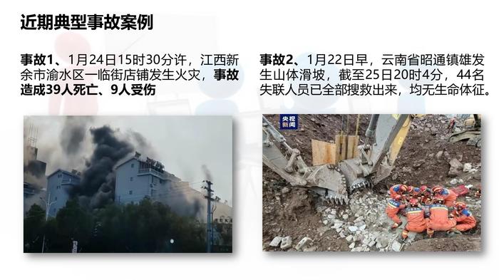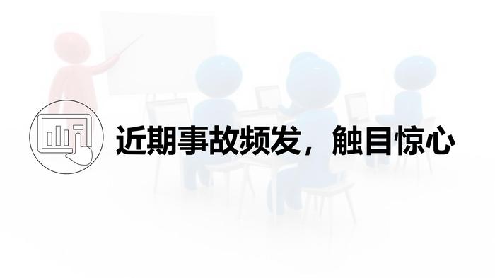 节后复工安全培训2024年国庆禁止吸烟手机静音这不是要求,是个人习惯我们需要一个安静的环境近期事故频发,触目惊心事故1、1月24日15时30分许,江西新余市渝水区一临街店铺发生火灾,事故造成39人死亡、9人受伤事故2、1月22日早,云南省昭通镇雄发生山体滑坡,截至25日20时4分,44名失联人员已全部搜救出来,均无生命体征。近期典型事故案例事故3、河南南阳一寄宿学校宿舍1月19日晚间发生火灾,13死1伤,都是小学生!事故4:1月12日14时55分许,河南平顶山天安煤业股份有限公司十二矿发生一起煤与瓦斯突出事故,16人遇难,安委会挂牌督办近期典型事故案例事故6、1月20日江苏常州金属粉尘爆炸,8死8伤!事故5、2024年1月23日,在建宾鹤高速公路大理州宾川县境内发生一起道路交通事故,造成8人死亡。近期典型事故案例事故8、1月29日3时23分,呼和浩特市新城区气象局西巷德都豪日娲餐馆发生火灾,造成4人死亡,4人受伤事故7、2024年1月20日晚19时左右,山东一废旧厂房爆炸起火,造成7人死亡,未办理任何手续的情况下违法组织生产化工品过程中发生事故近期典型事故案例目 录CONTENTS浅谈安全赶走“节后综合症”身边的“危害因素”安全(行为)管理应急管理结束语(安全文化)1浅谈安全马斯洛”的需求层次理论典型案例:银川“6.21”富洋烧烤燃气爆炸事故事故回顾:2023年6月21日20时37分许宁夏回族自治区银川市兴庆区富洋烧烤民族街店发生一起特别重大燃气爆炸事故造成31人死亡、7人受伤,直接经济损失5114.5万元 事故原因:事故调查组查明,事故直接原因是液化石油气配送企业违规向烧烤店配送有气相阀和液相阀的“双嘴瓶”,店员误将气相阀调压器接到液相阀上,使用发现异常后擅自拆卸安装调压器造成液化石油气泄漏,处置时又误将阀门反向开大,导致大量泄漏喷出,与空气混合达到爆炸极限,遇厨房内明火发生爆炸进而起火。由于没有组织疏散、唯一楼梯通道被炸毁的隔墙严重堵塞、二楼临街窗户被封堵并被锚固焊接的钢制广告牌完全阻挡,严重影响人员逃生,导致伤亡扩大。 事故惨痛结果警示:31人遇难,意味着31个家庭变得支离破碎,任何时候都应做到安全第一,事故没有如果,只有血淋淋的结果。银川市2023年06月21日典型案例:银川“6.21”富洋烧烤燃气爆炸事故-现场图安全为1,其余为000000000?安全,就是家人所有的期盼失去了人的“家”还是“家”吗?安全漫画,你看懂了吗本质安全设备如果列车车头能喷出高压气体,把来不及躲避的行人推出铁轨外,那该多好。是的,现在人们正在设计本质安全设备,但许多情况下还只能是美好的“安全梦”。列车车头的思考2赶走“节后综合症”“节后综合症”疲惫、情绪不稳定刚刚过完幸福、热闹的春节,现在又陆续返回施工现场,但许多人还沉浸在节日欢乐的气氛之中,生活节律还没有调整过来,自由散漫的心还没有收回来,主要体现在疲惫、情绪不稳定。人虽然到工地了,但心还在家里,思想不集中,这就是“节后综合症”,是很危险的隐患,是很容易发生事故的。很容易发生事故01赶走“节后综合症”赶走“节后综合症”停止熬夜、应酬等行为,早睡早起,尽快调整作息,慢慢适应以前有规律的作息时间。 做到起居有序,将自己的心力和心态都调整回工作上去。 多吃蔬菜,粗粮,保证营养均衡。赶走“节后综合症”冒险心理侥幸心理惰性心理技术不熟练、遇险惊慌员工心理4麻痹心理逞能心理576123环境干扰判断失误3身边的危害因素危险能量永不下班危害因素一个组织的活动、产品或服务中可能导致人员伤害或疾病、财产损失、工作环境破坏、有害的环境影响或这些情况组合的要素,包括根源和状态导致安全事故的4个条件人的不安全行为环境因素管理缺陷物的不安全状态人、物、管理、环境事故后果火 灾喷涂作业 液氨制冷爆 炸涉尘加工触 电中 毒有限空间其他伤害如尘肺、机械伤害等(涉尘、冶金、船舶…)一、火灾物质的燃烧过程液氨泄漏爆炸事故该事故造成121人遇难,76人受伤,3000名周围群众疏散。2013年6月3日清晨,吉林省德惠市宝源丰禽业有限公司发生液氨泄漏爆炸事故。事故简述事故结果可怕的事故现场可怕的事故现场吉林禽业公司火灾示意图点火源的控制灭火原理冷却灭火法 冷却固体到自燃点以下,液体到闪点以下,就不 能挥发出足够的气体而窒息。 窒息灭火法 阻止空气进入或不燃气体冲淡空气,降低与隔绝 氧含量。 隔离灭火法 将可燃物与火焰、氧气隔离。 化学抑制灭火法 将燃烧过程中产生的游离基抑制、降低。灭火剂的选择水和水蒸气 A类火灾及冷却用,注意扑救禁忌泡沫灭火剂二氧化碳灭火剂ABCE类 高浓度易中毒 需注意。干粉灭火剂 BC类 E类低压带电也可 A类要看干粉成分01020304二、爆炸化学爆炸的三要素放热气体迅速三、触电电伤是电流的热效应、化学效应及机械效应对人体外部造成的局部伤害,包括电弧烧伤、烫伤、电烙印等。触电事故触电事故是由电流的能量造成的,触电是电流对人体的伤害。电流对人体的伤害可分为电击和电伤。电 击电击是电流通过人体内部,破坏人的心脏、神经系统、肺部的正常工作造成的伤害。人身触技带电的导线、漏电设备的外壳或其它带电体,以及由于雷击或电容器放电,都可能导毁电击。触及正常带电体的电击称为直接电击,触及故障带电体的电击称为间接电击