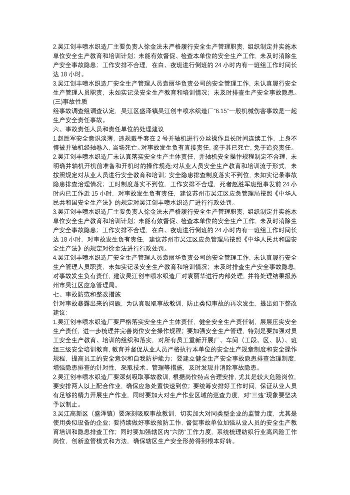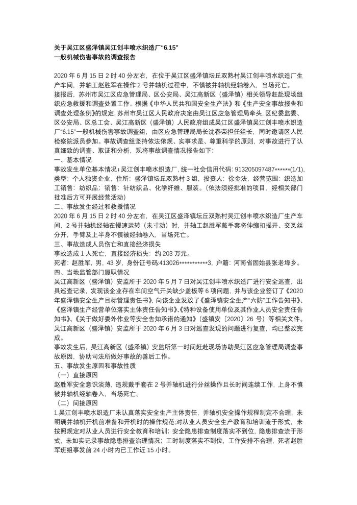 关于吴江区盛泽镇吴江创丰喷水织造厂“6.15”一般机械伤害事故的调查报告 2020年6月15日2时40分左右,在位于吴江区盛泽镇坛丘双熟村吴江创丰喷水织造厂生产车间,并轴工赵胜军在操作2号并轴机过程中,不慎被并轴机经轴卷入,当场死亡。接报后,苏州市吴江区应急管理局、区公安局、吴江高新区(盛泽镇)相关领导赶赴现场组织应急救援和调查处置工作。根据《中华人民共和国安全生产法》和《生产安全事故报告和调查处理条例》的规定,苏州市吴江区人民政府决定由吴江区应急管理局牵头,区纪委监委、区公安局、区总工会、吴江高新区(盛泽镇)人民政府组成吴江区盛泽镇吴江创丰喷水织造厂“6.15”一般机械伤害事故调查组,由区应急管理局局长沈春荣担任组长,同时邀请区人民检察院派员参加。事故调查组坚持依法依规、实事求是、尊重科学的原则,对事故进行了认真细致的调查、取证和分析,现将事故调查情况报告如下:一、基本情况事故发生单位基本情况:吴江创丰喷水织造厂,统一社会信用代码:913205097487******(1/1),类型:个人独资企业,住所:盛泽镇坛丘双熟村3组,投资人:徐金法,经营范围:织造加工销售:纺织品;销售:针纺织品、化学纤维、服装。(依法须经批准的项目,经相关部门批准后方可开展经营活动) 二、事故发生经过和救援情况2020年6月15日2时40分左右,在吴江区盛泽镇坛丘双熟村吴江创丰喷水织造厂生产车间,2号并轴机经轴在慢速运转(未寸动)时,并轴工赵胜军戴手套将伸缩扣摇开、交叉丝分开,手臂及上半身不慎被经轴卷入,当场死亡。三、事故造成人员伤亡和直接经济损失事故造成1人死亡,直接经济损失:约203万元。死者:赵胜军,男,43岁,身份证号码:413026***********3,户籍:河南省固始县张老埠乡。四、当地监管部门履职情况吴江高新区(盛泽镇)安监所于2020年5月7日对吴江创丰喷水织造厂进行安全巡查,出具巡查记录,发现该企业存在车间空气开关缺少盖板等6项问题,并与该企业签订了《2020年盛泽镇安全生产目标管理责任书》,向该企业发放了《盛泽镇安全生产“六防”工作告知书》、《盛泽镇生产经营单位落实主体责任告知书》、《特种设备使用单位及其作业人员安全责任告知书》、《关于做好委外作业等安全告知承诺的通知》(盛镇安〔2020〕26号)等相关文件。吴江高新区(盛泽镇)安监所于2020年6月3日对巡查发现的问题进行复查,均已整改完成。 事故发生后,吴江高新区(盛泽镇)安监所第一时间赶赴现场协助吴江区应急管理局调查事故原因,协助司法所做好事故的善后工作。五、事故发生原因和事故性质(一)直接原因赵胜军安全意识淡薄,违规戴手套在2号并轴机进行分丝操作且长时间连续工作,上身不慎被并轴机经轴卷入,当场死亡。(二)间接原因1.吴江创丰喷水织造厂未认真落实安全生产主体责任,并轴机安全操作规程制定不合理,未明确并轴机开机前准备和开机时的操作规范;对从业人员安全生产教育和培训流于形式,未按照规定对从业人员进行安全教育和培训;安全隐患排查制度落实不到位,隐患排查流于形式,未如实记录事故隐患排查治理情况;工时制度落实不到位,工作安排不合理,死者赵胜军班组事发前24小时内已工作近15小时。2.吴江创丰喷水织造厂主要负责人徐金法未严格履行安全生产管理职责,组织制定并实施本单位安全生产教育和培训计划;未能有效督促、检查本单位的安全生产工作,未及时消除生产安全事故隐患;工作安排不合理,在白、夜班进行倒班的24小时内有一班组工作时间长达18小时。 3.吴江创丰喷水织造厂安全生产管理人员袁丽华负责公司的安全管理工作,未认真履行安全生产管理人员职责,未如实记录安全生产教育和培训情况;未及时排查生产安全事故隐患。(三)事故性质经事故调查组调查认定,吴江区盛泽镇吴江创丰喷水织造厂“6.15”一般机械伤害事故是一起生产安全责任事故。六、事故责任人员和责任单位的处理建议1.赵胜军安全意识淡薄,违规戴手套在2号并轴机进行分丝操作且长时间连续工作,上身不慎被并轴机经轴卷入,当场死亡。对事故发生负有直接责任,鉴于其已死亡,免于追究责任。2.吴江创丰喷水织造厂未认真落实安全生产主体责任,并轴机安全操作规程制定不合理,未明确并轴机开机前准备和开机时的操作规范;对从业人员安全生产教育和培训流于形式,未按照规定对从业人员进行安全教育和培训;安全隐患排查制度落实不到位,未如实记录事故隐患排查治理情况;工时制度落实不到位,工作安排不合理,死者赵胜军班组事发前24小时内已工作近15小时,对事故发生负有责任,建议苏州市吴江区应急管理局按照《中华人民共和国安全生产法》的规定对吴江创丰喷水织造厂进行行政处罚。 3.吴江创丰喷水织造厂主要负责人徐金法未严格履行安全生产管理职责,组织制定并实施本单位安全生产教育和培训计划;未能有效督促、检查本单位的安全生产工作,未及时消除生产安全事故隐患;工作安排不合理,在白、夜班进行倒班的24小时内有一班组工作时间长达18小时,对事故发生负有责任,建议苏州市吴江区应急管理局按照《中华人民共和国安全生产法》的规定对徐金法进行行政处罚。4.吴江创丰喷水织造厂安全生产管理人员袁丽华负责公司的安全管理工作,未认真履行安全生产管理人员职责,未如实记录