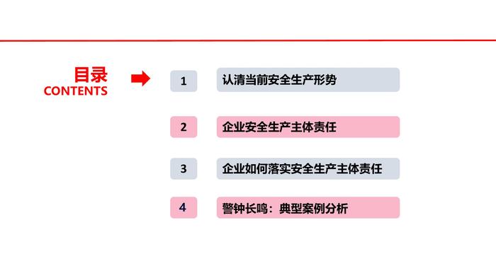 认清安全生产形势落实企业主体责任XXXXXX有限公司主讲:ABC安全1认清当前安全生产形势2企业安全生产主体责任目录 CONTENTS3企业如何落实安全生产主体责任 4警钟长鸣:典型案例分析01认清当前安全生产形势2021年4月22日,上海金山亭林工业园区内的胜瑞电子科技(上海)有限公司发生火灾,这场持续救援17个小时的火灾,造成2名消防人员牺牲,6名企业相关人员遇难。 应急管理部要求事发地对该起事故提级调查。经国务院安全生产和消防工作考核工作组初步核查,发现涉事企业外来作业人员管理失控,在火灾发生后没有第一时间通知撤离,违规将消防控制室外包给保安公司值守,车间违规使用大量可燃易燃材料,火情巡查制度形同虚设。事 故 通 报2021年5月24日,四川省宜宾市长宁县福荣笋类食品厂在检修设施时发生疑似有害气体中毒事件,造成7死1伤。 近年来,硫化氢中毒事件屡见不鲜,据不完全统计,自2012年以来,化工行业发生的较大及以上事故中,中毒事故共33起,其中因硫化氢造成的中毒事故18起,共导致62人死亡。事 故 通 报国务院安委办突击夜访企业,发现隐患责令停产 2021年5月1日,国务院暗查暗访组突击夜查广西广明码头仓储有限公司,现场检查出17项安全生产问题,其中包括5项重大隐患。 整改要求:责令企业立即停产整顿,限期对照清单整改。 停产整改!国务院安委办随机查出上海一企业29项安全问题 2021年5月3日,国务院暗查暗访组在上海金山第二工业园区内的东邦(上海)化学有限公司现场检查出29项安全生产问题,其中包括4项重大隐患。 整改要求:企业被责令停产,限期对照清单整改。明察暗访---你安全生产了吗?国务院安委办暗访组抽查陕西企业:部分企业风险评估报告造假 2021年5月,国务院暗查暗访组先后抽查了8家粉尘涉爆企业和3家铝加工企业均不同程度地存在问题:有的企业委托的中介机构弄虚作假,出具虚假风险评估报告;还有的企业未进行自查自改,整改不及时不到位。 整改要求:督促对中介机构的违法行为立案处罚和行业禁入,纳入不良记录“黑名单”;责令相关隐患企业暂时停止使用相关存在重大隐患的设备,并限期整改安全隐患。明察暗访---你安全生产了吗? 福建泉州的3.7酒店坍塌,浙江温岭的6.13的槽罐车爆炸等重大事故,都暴露出我们一些地方部门的单位对一些主体责任不落实的企业领导监管不到位,对这些企业长期存在的一些违法违规和违纪问题,执法不严,检查形式主义、官僚主义,查而不处、以罚代处,变相纵容这些企业一而再再而三的违法违规。刚才我点的2起事故,调查通报都能看出,多个部门去查,各个部门监管,罚而不处、不治、不整改,不及时查处、不严格查处、只查不处、只罚不处必然要酿成大祸。国 内 安 全 形 势“忽视安全生产将面临刑责”针对强令违章冒险作业罪,以及关闭生产安全设备设施和数据信息,拒不整改重大事故隐患,未经审批擅自开展高危生产作业活动,以及提供虚假证明文件等涉及安全生产突出问题的刑法作出修改完善。企业必须高度重视安全生产工作,否则即使不发生生产安全事故,也可能被追究刑事责任。国 内 安 全 形 势屡罚不改,危险作业罪3月24日,浙江省温州市平阳县应急管理局在“小化工”专项整行动排查过程中,执法人员突击检查某企业仓库,现场查获油墨280桶,并依法予以扣押,由专门车辆转运到安全地带。该非法储存点100米范围内住户300余户,居住人员1000余人,属于人员密集居住区域,存在重大安全隐患,一旦发生爆炸,后果不堪设想。经核查,该批油墨属洪某某所有,其长期无证非法储存经营危险化学品油墨,且分别于2013年、2015年曾被属地监管部门予以行政处罚。相对洪某某的违法收入来说,行政处罚罚款微乎其微,违法成本很低,导致其心存侥幸,通过不断更换危险化学品储存窝点等方式逃避检查,且屡罚不改。此次,当地应急管理部门同司法机关积极对接,犯罪嫌疑人洪某某以“危险作业罪”被属地公安机关采取刑事强制措施。拒不整改重大事故隐患,危险作业罪1月28日,浙江省湖州市南浔区应急管理局组织多部门开展安全生产联合检查,执法人员对某建材公司执法检查时发现其戊烷罐储存仓库及戊烷气化间存在多处安全隐患,执法人员依法开具了现场处理措施决定书,责令该企业立即停止使用戊烷相关设备并采取排除危险的整改措施。3月17日,湖州市南浔区和孚镇工作人员在日常巡查时发现该建材公司仍在使用戊烷相关设备。接报相关信息后,南浔区应急管理局执法人员立即赶赴该企业,发现企业拒不执行此前下达的现场处理措施决定书要求,戊烷罐储存仓库存在的重大隐患未整改, 储罐内存有新购进的戊烷约26吨,一旦发生泄露爆炸,后果不堪设想。执法人员当即责令该企业停止使用戊烷相关设备并对启动设备进行了查封。随后,湖州市南浔区应急管理局将涉事企业负责人余某某拒不整改重大事故隐患涉嫌“危险作业罪”的犯罪线索移送公安机关立案查处,此为全国首例“因拒不整改重大事故隐患被追究刑事责任”的案件。02企业安全生产主体责任《安全生产法》涉及的四个主体主体责任:企业是生产经营活动的主体,是安全生产工作责任的直接承担主体。 企业安全生产主体责任:是指企业依照法律、法规规定,应当履行责任,如果没有做好自己工作,而应该承担的不利后果或者强制性义务