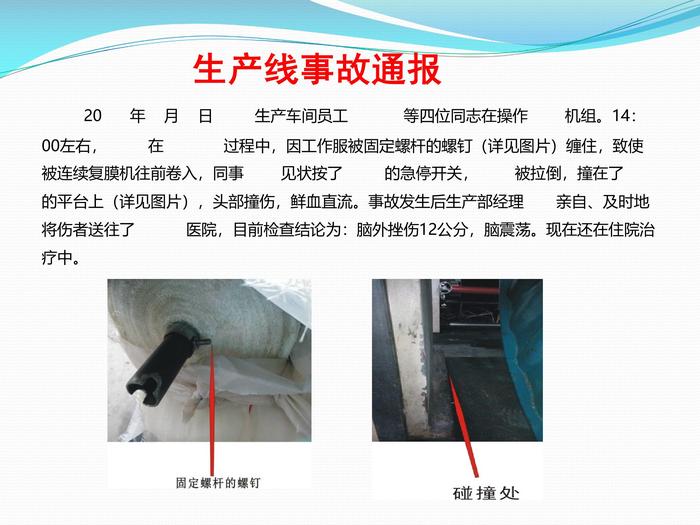 安全事故“四不放过”处理原则培训 生产线事故通报 20 年 月 日 生产车间员工 等四位同志在操作 机组。14:00左右, 在 过程中,因工作服被固定螺杆的螺钉(详见图片)缠住,致使 被连续复膜机往前卷入,同事 见状按了 的急停开关, 被拉倒,撞在了 的平台上(详见图片),头部撞伤,鲜血直流。事故发生后生产部经理 亲自、及时地将伤者送往了 医院,目前检查结论为:脑外挫伤12公分,脑震荡。现在还在住院治疗中。 同志伤情前言: “四不放过”原则的支持依据是《国务院关于特大安全事故行政责任追究的规定》(国务院令第302号)拟定。安全生产事故都会给国家和人民生命财产造成损失,影响社会稳定和企业效益,所有事故的原因虽然各有不同,但都能总结出许多教训,值得我们去深刻对待吸取。它山之石,可以攻玉,只有认真学习典型的安全事故案例,把别人的事故当成自己的事故对待,真正吸取事故教训,做到举一反三,才能杜绝类似事故的发生。 一、安全事故“四不放过”处理原则主要内容是: 1、事故原因未查清不放过; 2、事故责任人未受到处理不放过; 3、事故责任人和广大群众没有受到教育不放过; 4、事故没有制订切实可行的整改措施不放过。 二、具体含义 1、“四不放过”原则的第一层含义是要求在调查处理伤亡事故时,首先要把事故原因分析清楚,找出导致事故发生的真正原因,不能敷衍了事,不能在尚未找到事故主要原因时就轻易下结论,也不能把次要原因当成真正原因,未找到真正原因决不轻易放过,直至找到事故发生的真正原因,并搞清各因素之间的因果关系才算达到事故原因分析的目的。 2、“四不放过”原则的第二层含义是要求在调查处理工伤事故时,不能认为原因分析清楚了,有关人员也处理了就算完成任务了,还必须使事故责任者和广大群众了解事故发生的原因及所造成的危害,并深刻认识到搞好安全生产的重要性,使大家从事故中吸取教训,在今后工作中更加重视安全工作。 3、“四不放过”原则的第三层含义是要求必须针对事故发生的原因,在对安全生产工伤事故必须进行严肃认真的调查处理的同时,还必须提出防止相同或类似事故发生的切实可行的预防措施,并督促事故发生单位加以实施。只有这样,才算达到了事故调查和处理的最终目的。 4、“四不放过”原则的第四层含义也是安全事故责任追究制的具体体现,对事故责任者要严格按照安全事故责任追究规定和有关法律、法规的规定进行严肃处理。 三、安全事故“四不放过”处理原则的作用 1、吸取事故教训,细化了吸取事故教训的具体措施 发生事故,暴露了人员、设备、技术、环境、管理上的诸多问题,通过按照“四不放过”原则吸取他人事故教训的方式,以心得体会、建议措施上报,不说套话、废话,就让全体员工实实在在分析发现问题,做实了吸取事故教训的方法,取得了良好的实效。 2、起到了警示作用,提高了全员安全意识 各企业都制定有对安全生产事故责任者的处理规定,但往往职工都不会去关心这些规定,因为都觉得自己不会是事故责任人。而我们在落实“四不放过”原则过程中,增设一个假如:假如身边发生这样的事故、我是事故责任人,对照事故处理法律法规和公司安全管理规定,应该受到什么样的处理;假如我是事故的受害人,我的家庭、亲人会遭受什么样的打击的大讨论不放过。通过假设和对照,使全体员受到震动和冲击。虽然是假设,但也使全体员工感到了一旦发生事故带来的压力,受到了很强的安全教育,对自己的安全责任重新认识和提高,增强了责任感和安全意识,比空洞的说教更有说服力。 3、切实发现并消除了隐患,提高了本质性安全 四、“四不放过”原则安全管理创新应用 前言:生产安全事故是由于人的不安全行为或机械设备的不安全因素等原因造成的。为了防范类似事故重复发生,在处理事故中要坚持“四不放过”的原则。对于事故处理,国家早在1975年就提出了“三不放过”原则。 “四不放过”原则的第一原则是首先要针对事故,认真分析,找出导致事故发生的真正原因。第二个原则是新增加的内容,突出了要对有关责任者进行严肃处理,这是落实国家对事故责任者追究的具体体现。第三个原则是不能认为分析清楚了原因,处理了有关人员就算完成事故处理了,还必须通过分析事故发生的原因和危害,使广大职工从中受到教育、吸取教训,进而提高认识,努力在实际工作中防止事故的发生。第四个原则是要针对事故发生的原因,不但要制定出防止类似事故重复发生的预防措施,还要针对事故发生所暴露出的不安全因素进行彻底整改。只有这样,才能通过处理已发生的事故,收到预防事故重复发生的良好效果。 对于这“四不放过”,前三者是“事务性”的,而第四个则是“实质性”的;前三者是基础,第四者是关键;因为只有查清了事故原因、处理了责任者、落实了整改措施,才能真正吸取教训。然而,当前往往是前三者做的比较好,而忽视了对教训的吸取。 “四不放过”,不能只停留在口头上,而是应该有具体的实实在在的行动,不仅要做到查清原因、处理责任人、落实整改措施,更重要的是要深刻吸取教训,举一反三,做好安全生产的监管和预防工作。安全生产事故一旦发生,就会伴随着无辜生命的死亡,这样的教训有一次就够了,不要总是吸取,甚至是总不吸