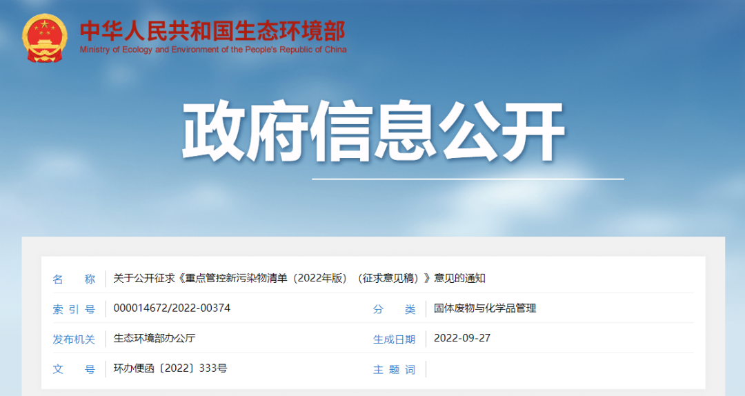 最新!《重点管控新污染物清单(2022年版)》(征求意见稿)