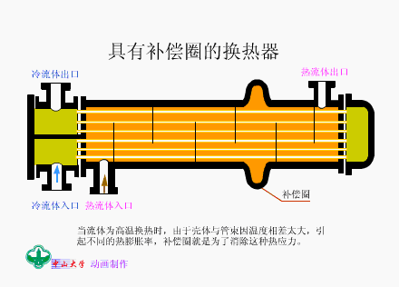由挡板、补偿圈和放热嘴构成的换热器。当流体为高温换热时,由于壳体与管束因温度相差太大,引起不同的热膨胀率,补偿圈就是为了消除这种热应力。