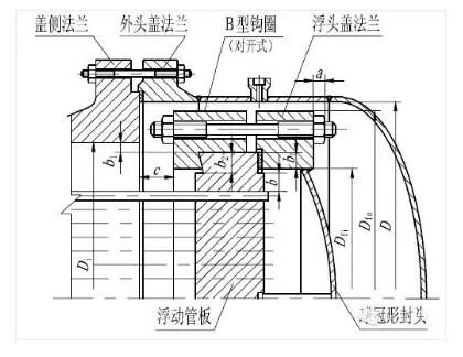 浮头式换热器浮头端结构由圆筒、外头盖侧法兰、浮头管板、钩圈、浮头盖、外头盖及丝孔、钢圈等组成。钩圈式浮头的详细结构见下图所示。
