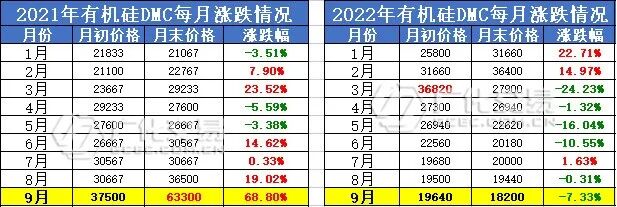 结合上述价格表,以及对比2021年及2022年的涨跌幅柱状图可知, 2 021年9月是有机硅DMC涨势最猛的一个月,而2022年9月有机硅却仍处于下行状态, 业内一度有预言将跌破1.7万元!