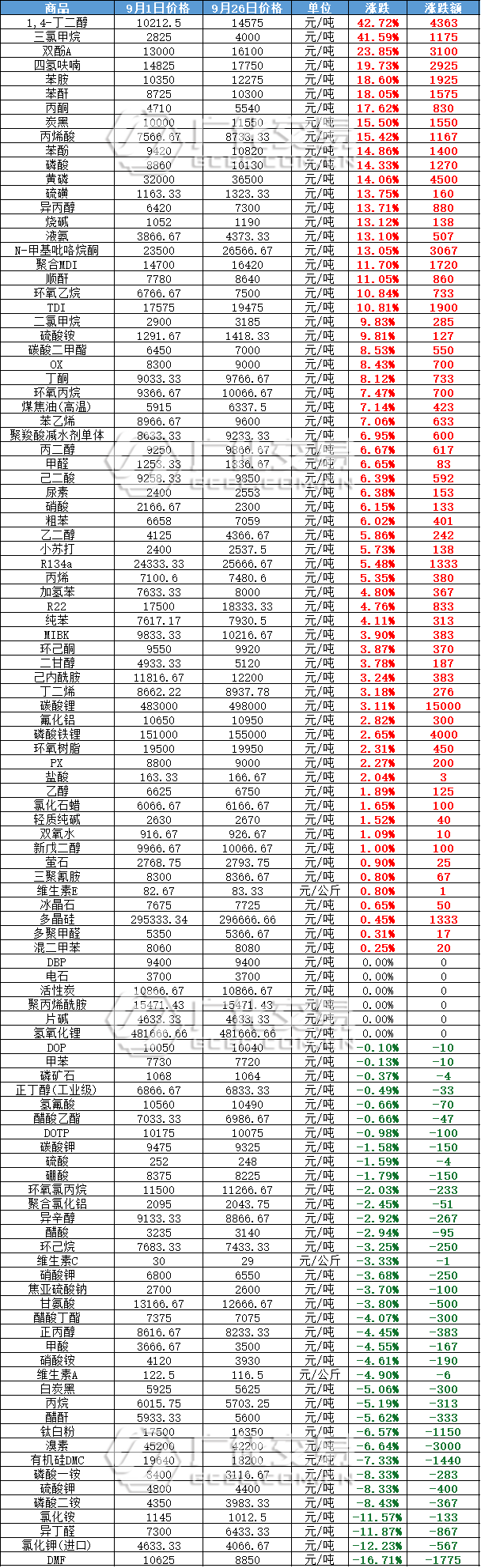 2020年、2021年的九月,是化工市场久违的狂欢。多种原料一涨再涨, 突破历年价格新高,有机硅、 醋酸、烧碱、碳酸锂、黄磷等大宗均 甚至直接打破记录, 创造十年来的最高涨幅!