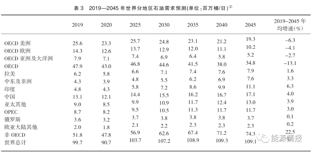 欧佩克作为卖方提供的数据一般倾向于夸大需求和短缺,其提供的预测是 2040 年全球原油需求达到峰值(见表3),国际能源署预测全球石油需求在 2030 年达到峰值,本文折中 2035 年作为全球石油需求达到峰值之年。2035 年之前,国际原油市场仍然依赖“欧佩克 +”提供原油,“欧佩克 +”的控制能力不会减弱,但“欧佩克 +”的市场份额增加速度将持续放缓。