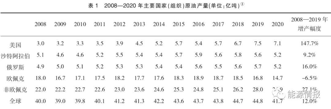 自 2008 年前后美国页岩革命水平井、压裂技术取得重大突破以来,美国页岩油产量迅猛 增长, 2017 年美国原油产量达 5.7 亿吨,超过沙特、俄罗斯,成为世界上最大的原油生产国。 从 2008 年到 2019 年,美国页岩油产量高达 4.5 亿吨,原油产量从 3.0 亿吨猛增到 7.5 亿吨,增幅高达 147.7% (见表 1 )。 2013 年美国还曾是世界上最大的原油进口国, 2019 年 9 月美国首次实现月度原油净出口。 页岩革命改变了国际原油市场格局,世界最大的原油进口国由美国变为中国,印度超过日本成为第二大原油进口国。