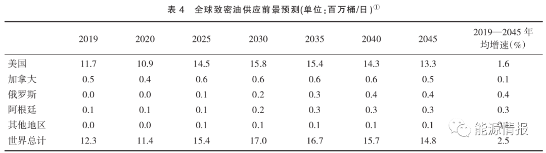 低碳时代原油需求增长放缓,中长期对原油需求下降的普遍认识将使原油开发生产投入大幅减少,无论是出口国还是进口国,普遍缺乏增加原油产能投入动力,原油公司更加偏好于那些短期就能见到产出的项目,甚至拒绝投入资金扩大勘探增加石油储量,这已成为世界油气行业发展新常态。近年来,新增储量增速降至历史最低水平,为此各国将面临油气严重缺口风险。美国页岩油产量可能在 2030 年左右达到峰值并开始下降(见表 4)。为维持当前石油开采水平至 2040 年,全球油气领域投资需达到 17万亿美元,约为能源投资总额的三分之一。