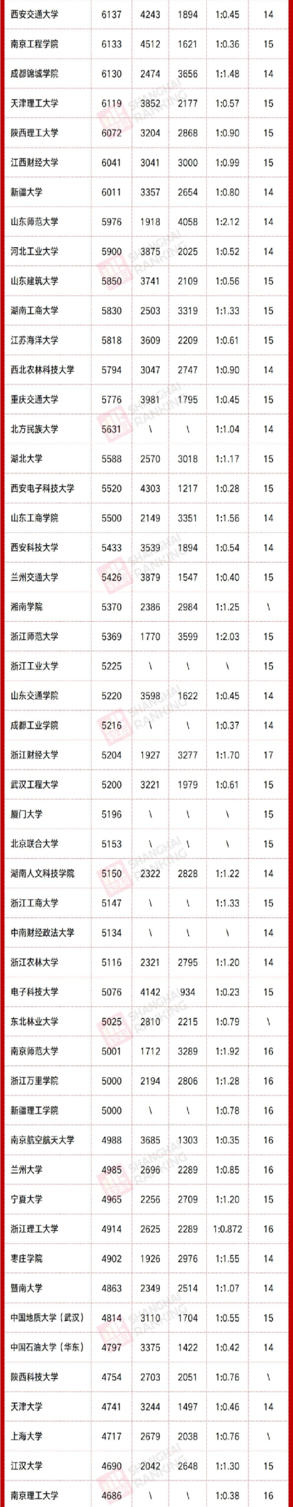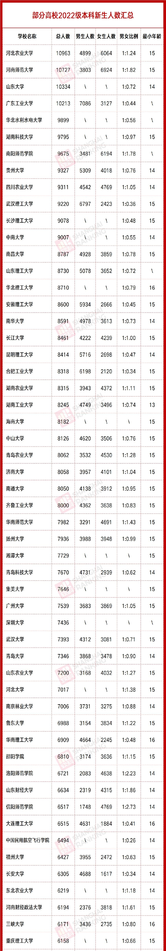 在最大年龄方面,南开大学有新生1979年出生,是目前统计到年龄最大的本科生!新疆大学有新生1982年出生,今年已经40岁,与该校出生于2008年的14周岁新生相差26岁。此外,北京交通大学、北京师范大学、同济大学、中国海洋大学、武汉大学、中南大学、华南师范大学等院校的新生最大年龄均超过30岁。