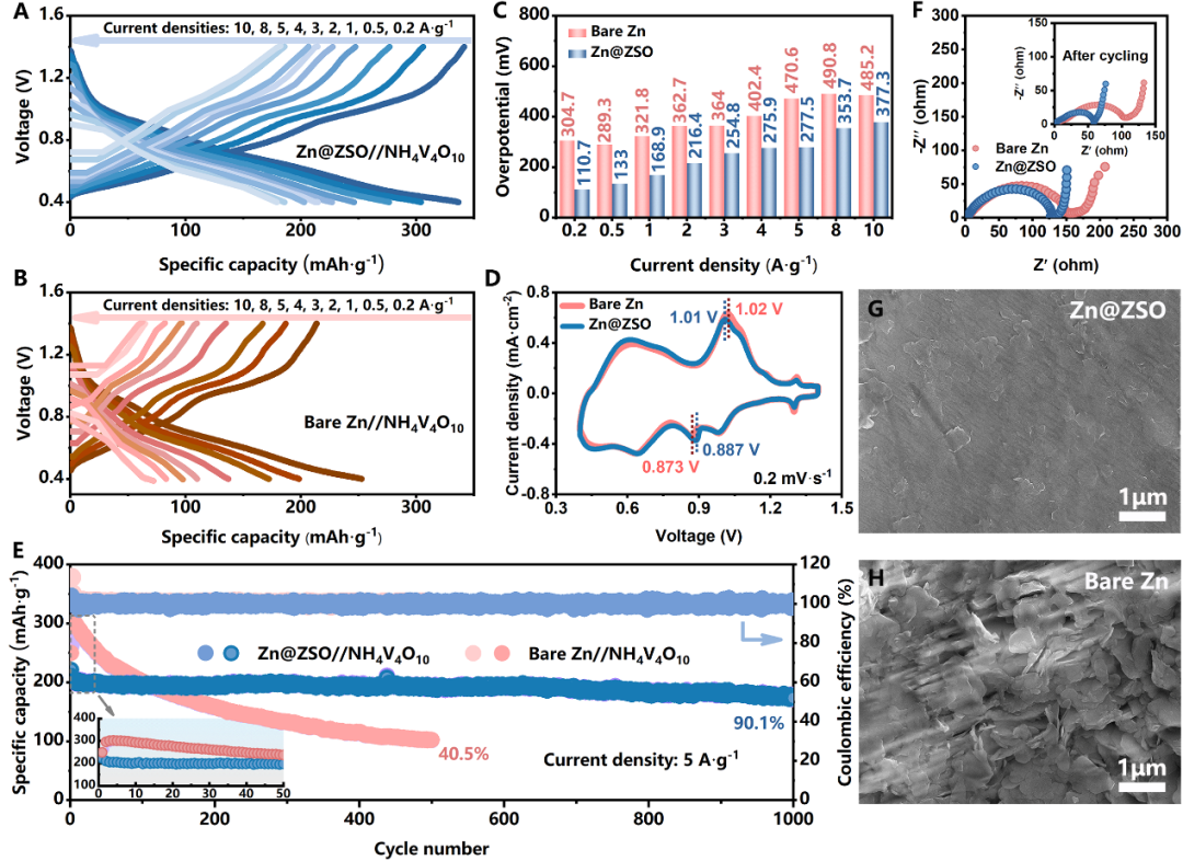 电流密度下的长寿命循环性能和库仑效率;(F-H) 阻抗 (F)、裸Zn (G)和Zn@ZSO (H)阳极在50次循环后的SEM图像。