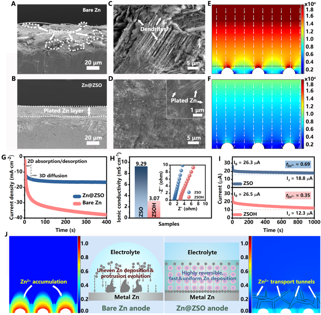 迁移数;(J) 裸锌和Zn@ZSO阳极的Zn