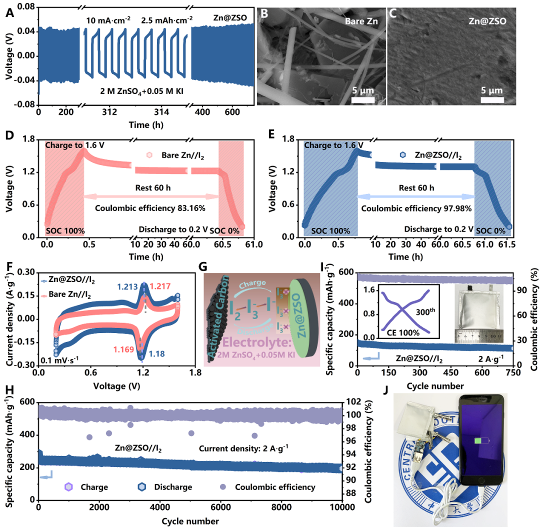性能测试结果证实了ZSO界面层在抑制多碘化物与Zn金属反应的有效性和电池耐久稳定运行的可行性。