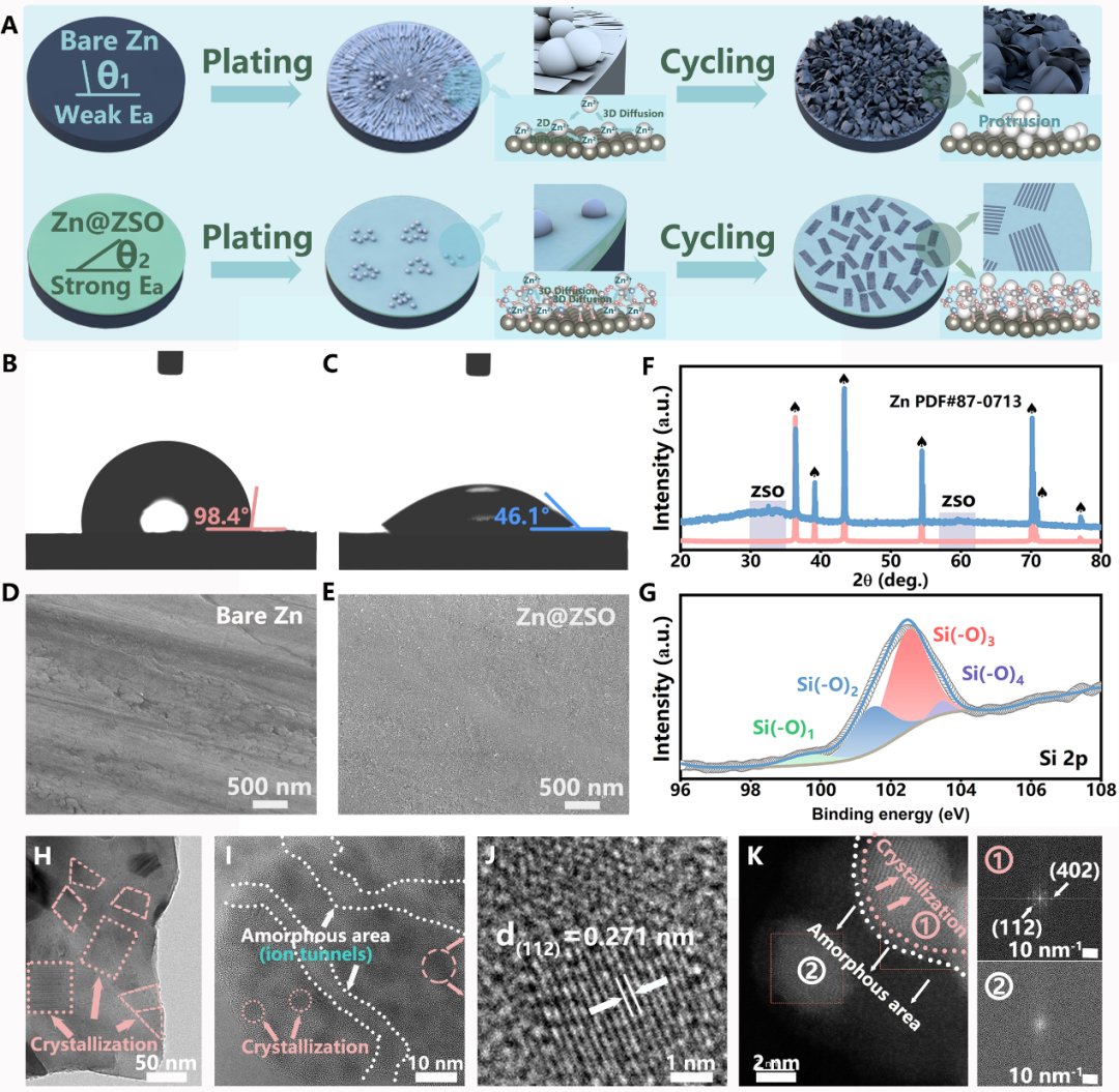 水溶液在 (B) 裸锌箔和 (C) Zn@ZSO样品上的接触角;(D和E) (D) 裸锌和 (E) Zn@ZSO样品的SEM图像;(F)裸Zn(粉红色)和Zn@ZSO(蓝色)样品的XRD图谱;(G) Zn@ZSO样品的高分辨率Si 2p XPS光谱;(H和I) (H) ZSOH和(I) ZSO样品的TEM图像;(J和K) ZSO样品的 (J) HRTEM图像、(K) HAADF-STEM图像和傅里叶变换图像。