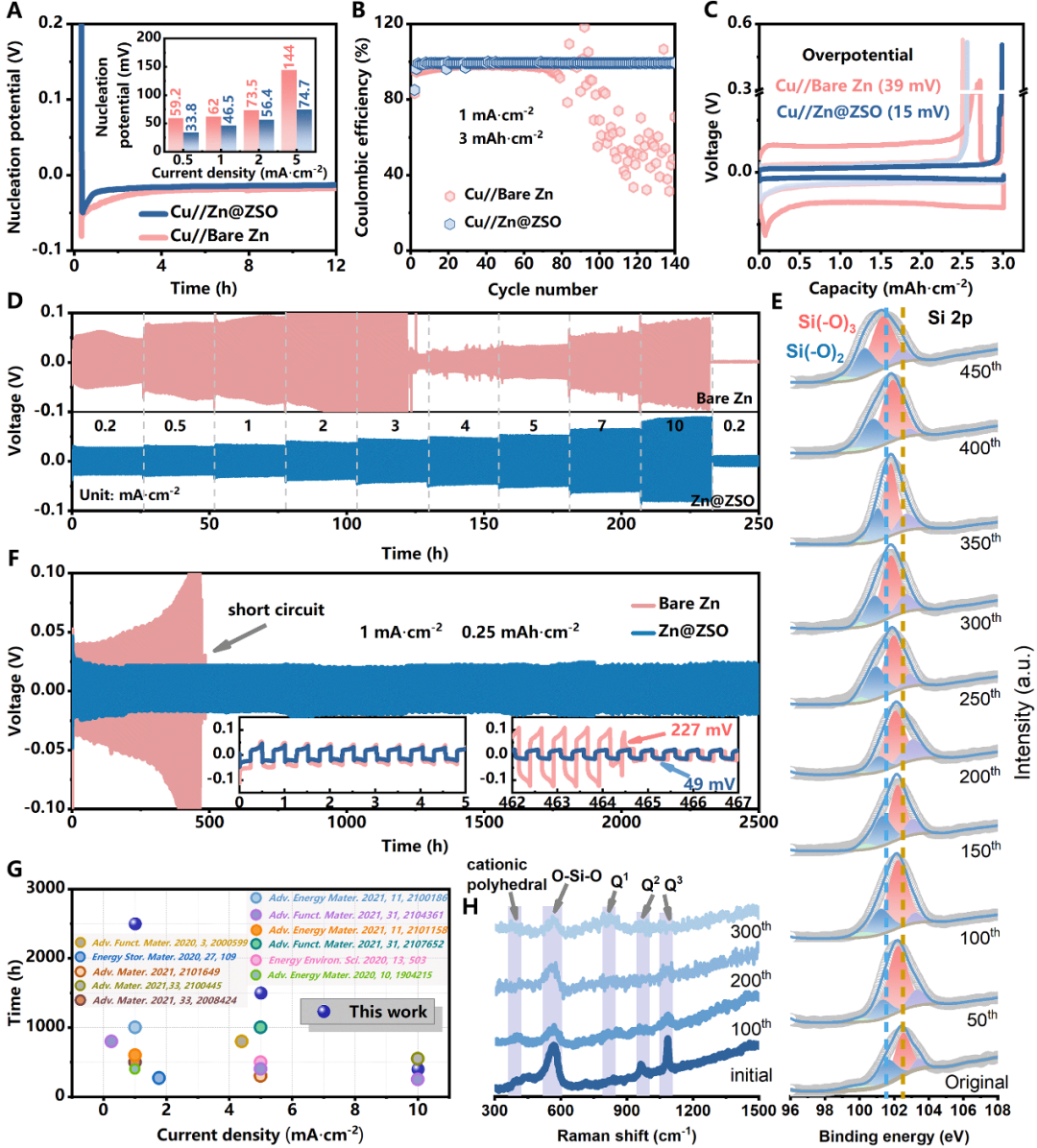 下的恒电流电压曲线;(G) Zn@ZSO阳极与其他最新报道的Zn金属阳极的剥离/电镀和电流密度的比较;(H) 重复剥离/电镀循环下Zn@ZSO电极的拉曼分析。