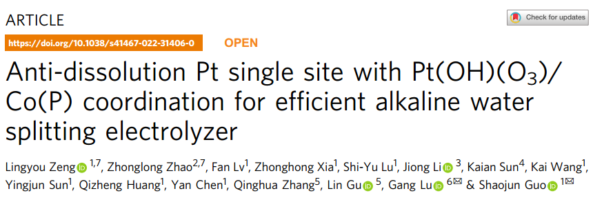 . Anti-dissolution Pt single site with Pt(OH)(O3)/Co(P) coordination for efficient alkaline water splitting electrolyzer. Nat. Commu. 2022. 13, 3822.