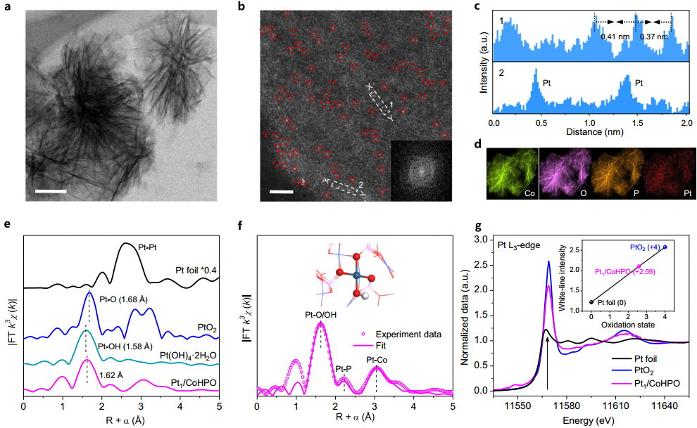 /CoHPO的纳米片组装花状的结构;HAADF-STEM显示Pt原子原子级地分散在无定形 CoHPO上;ICP光谱证实 Pt