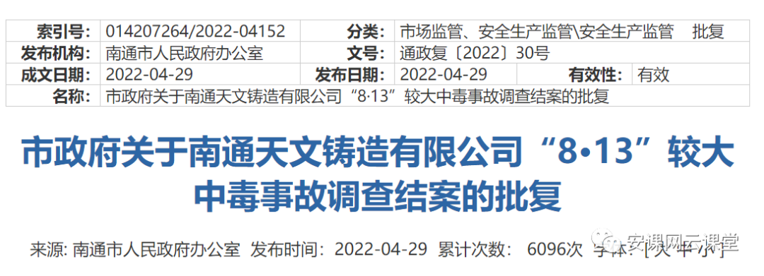 南通市人民政府于2022年4月29日批复了南通天文铸造有限公司“8·13”较大中毒事故调查结案,但该网页上的确没有附上本起事故调查报告。