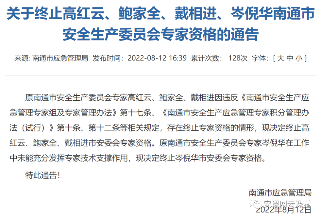 关于终止高红云、鲍家全、戴相进、岑倪华南通市安全生产委员会专家资格的通告