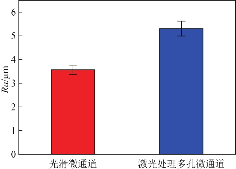 本实验首先采用电火花线切割加工技术,在长×宽×高为45mm×20mm×2mm紫铜板(铜质量分数为99.9%)上加工了12条宽度为0.7mm、高度为1mm的矩形微通道,其中微通道的中心间距为1.7mm。然后将微通道样品放入超声波清洗机中依次使用汽油、无水乙醇和去离子水清洗15min。最后,用干燥空气吹干微通道样品。采用激光直写技术对矩形微通道表面进行处理,如图1所示,光纤激光发射的激光束通过反光镜和聚焦镜聚焦到矩形微通道的表面,激光束在程序的控制下从前往后,从左往右然后再往下运动,微通道表面在激光的作用下发生烧蚀熔融,形成粗糙多孔结构。其中该激光器参数设置为以20kHz重复频率产生100ns脉冲,发射中心波长为1064nm激光,激光器的最大输出功率为30W,详细的设置参数见文献。图2为激光直写前后微通道壁面扫描电镜(SEM)图像比较。从图中可以看出,激光处理后微通道表面形成了许多微空腔的多孔粗糙结构,如图2(b)中虚线圈所示。采用3D共聚焦轮廓仪对微通道表面轮廓进行扫描,并测量微通道底部3个不同位置的表面粗糙度并取平均值。如图3所示,多孔壁面微通道的表面粗糙度 Ra 相对于未进行处理的光滑微通道提升了48.7%,其不确定度的上下限如图中误差棒所示,对于光滑微通道的不确定度范围为±0.16μm,对于激光处理多孔微通道的不确定度范围为±0.25μm。