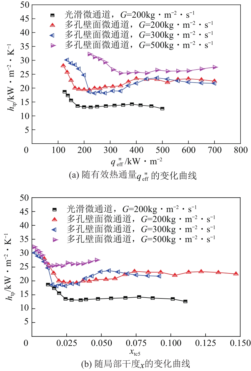 此外,从图9(a)可以看出在小质量流速范围内,质量流速 G =200kg/(m 2 ·s)与 G =300kg/(m 2 ·s)情况下多孔壁面微通道的局部对流换热系数 h tp 曲线基本重合,而对于 G =500kg/(m 2 ·s)条件下的 h tp 曲线要明显高于 G =200kg/(m 2 ·s)和 G =300kg/(m 2 ·s)条件,这与之前的文献实验结果的趋势相一致。可能原因是在小流速范围内,由于多孔壁面微通道的多孔结构对于沸腾换热性能的提升已经很明显,流量的增加对于沸腾换热的增强基本忽略不计;随着质量流率的进一步增加,流量对于换热增强不可忽略。多孔壁面微通道在 G =500kg/(m 2 ·s)阶段的两换热系数相对于 G =200kg/(m 2 ·s)情况下最大提升了30%,多孔壁面微通道在高流速情况下流动沸腾传热性能显著增强。