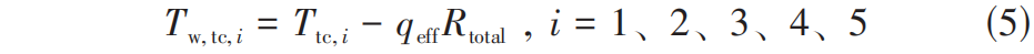 式中, R total 为热电偶到换热壁面的总热阻,包括热电偶到加热块顶部的热阻、焊锡膏的热阻、微通道底部到换热壁面的热阻,详细的计算方式参考本文作者课题组之前的工作。