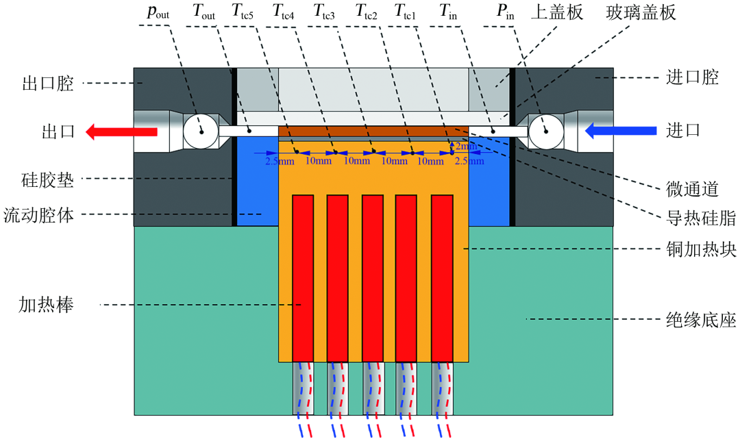 实验测试端的剖面如图5所示。测试段部分主要由聚醚醚酮绝缘底座、铜加热块、聚醚醚酮流动腔体、测试样品、Pyrex 7740玻璃盖板、铝合金盖板、进出口环氧树脂整流腔体和加热棒组成。测试样品通过内置10个加热棒的铜加热块进行加热,最大总功率为1kW,加热棒与自耦变压器和数字功率计相连,通过调节自耦变压器来改变总加热功率。铜加热块的上表面为45mm×20mm,与测试样品一致,采用薄焊料层将测试样品与铜加热顶部连接在一起。为了防止工作液体的泄漏,在进出口环氧树脂整流腔体,聚醚醚酮流动腔体以及Pyrex 7740玻璃盖板之间采用O形密封圈和密封胶进行密封,并采用螺栓进行紧固。此外,参考之前的研究经验,在测试段的进口和出口处连接不锈钢管来降低两相流动的不稳定性。