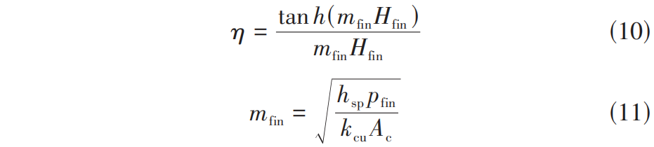 式中, p fin 和 A c 分别为单条微通道横截面湿翅片周长和横截面面积。