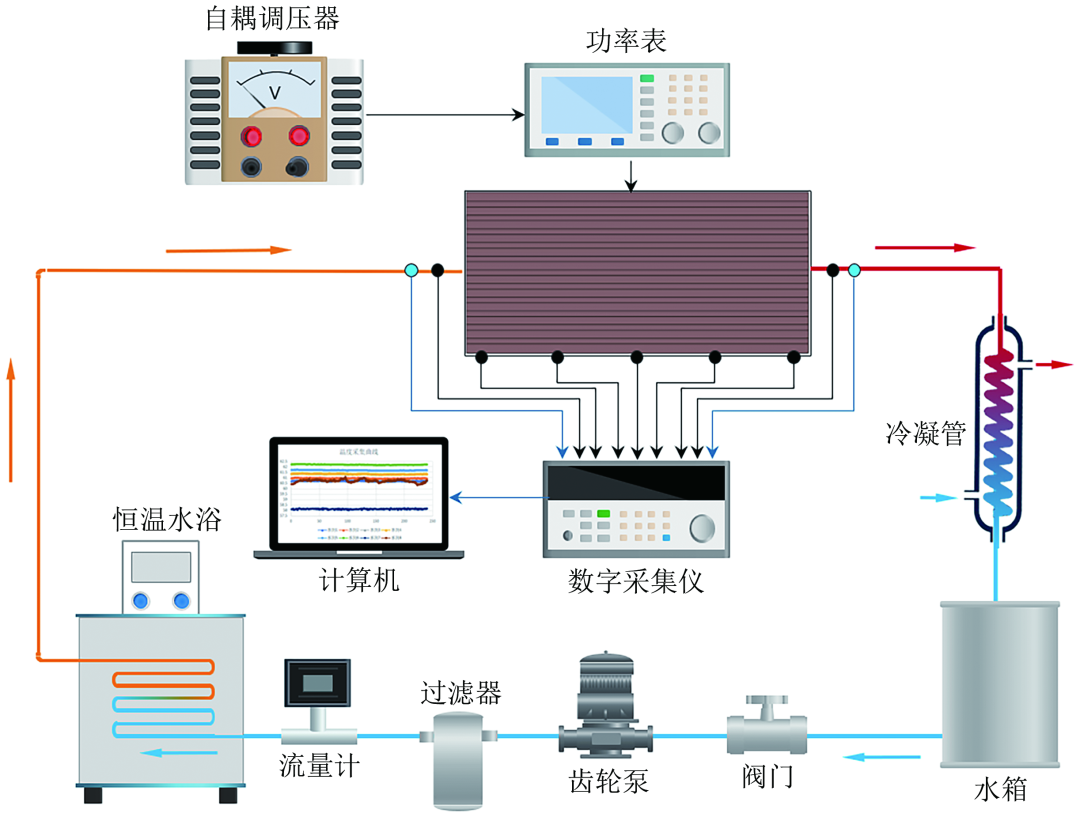 图4为实验测试系统的示意图。该测试回路主要由水循环系统、测试段、加热系统和数据采集系统组成。本实验采用去离子水作为工作流体,存储在水箱当中。水箱内置加热器,通过加热沸腾排出工作液中的杂质气体。水循环系统由齿轮泵驱动,将水箱中的去离子水以恒定速率泵出,然后依次通过过滤器、流量计以及浸在恒温水浴中的铜换热盘管后流向测试段。通过调节恒温水浴的温度以及对盘管出口和微通道进口之间管道进行保温来确保入口温度达到设定值。去离子水在测试段进行热交换后通过盘管冷凝器冷却,然后返回到大水箱当中,重复开始下一个循环。