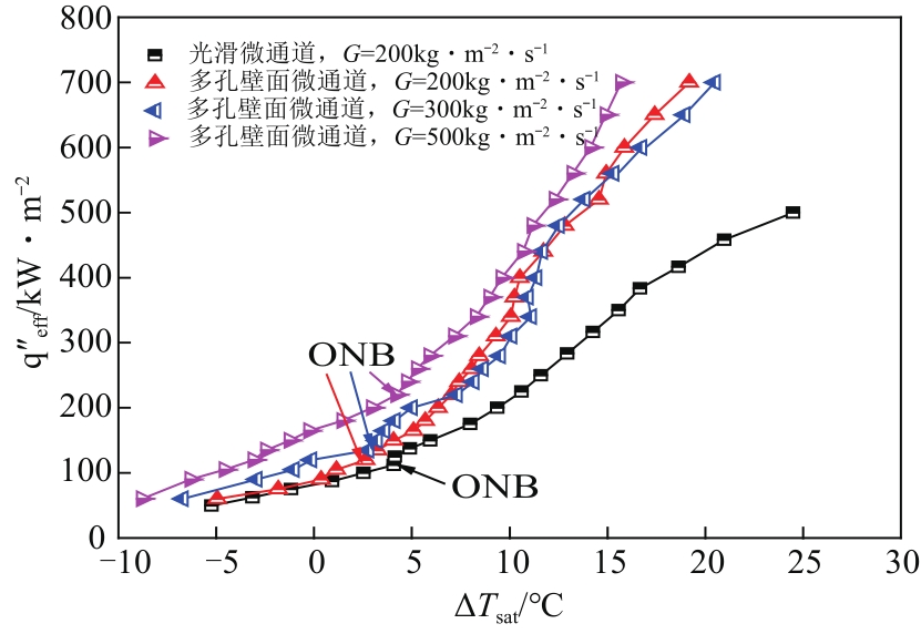 此外,如图8所示,随着质量流率的增加,多孔壁面微通道单相换热性能更强,同时核态沸腾起始点ONB也越高,原因在于高质量流率条件下,流体与换热边界的换热更快,微通道内更加难以达到沸腾换热阶段。在沸腾换热阶段, G =200kg/(m 2 ·s)与 G =300kg/(m 2 ·s)情况下多孔壁面微通道的沸腾曲线基本重合,可能原因是在小流速范围内,由于多孔壁面微通道内多孔结构对于换热性能的提升已经很明显,流量的增加对于沸腾的增强基本忽略不计;随着质量流速的进一步增加,流量对于换热增强不可忽略,在 G =500kg/(m 2 ·s)条件下的流动沸腾曲线要明显高于 G =200kg/(m 2 ·s)和 G =300kg/(m 2 ·s)条件。