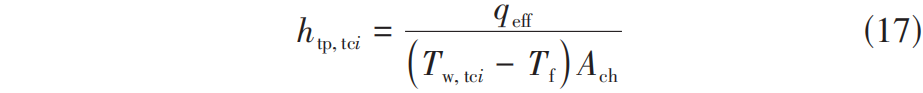 在本研究中,局部沸腾换热系数计算的位置为靠近出口处的热电偶位置( T t c5 ),原因在于该处与最大的饱和沸腾量有关,这种方式在之前的许多研究中都被采用。局部两相沸腾换热系数( h tp,tc i )由式(17)确定。