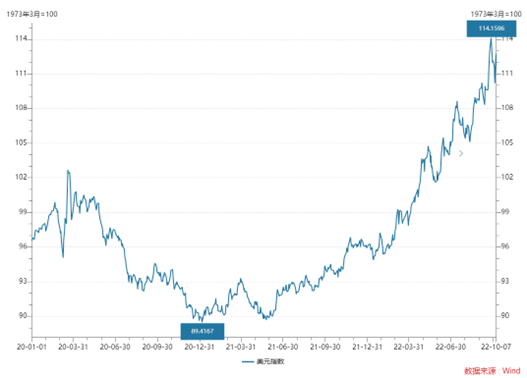 在美国疯狂的加息下,美元指数出现大幅的上涨。前不久,美元指数突破114点大关,较其低点上涨了27.67%。