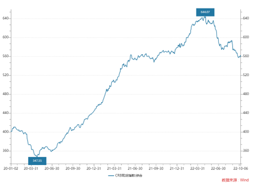 首先,从大宗商品价格来看,2022年5月,CRB商品指数触顶达到644.04点,较低点(2020年4月)上涨了296.52点,涨幅高达85.31%。