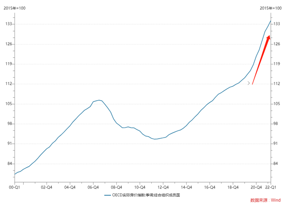 其次,从房价来看,据OECD统计,疫情期间(9个季度),经合组织成员国实际房价指数共计上涨了18.8个点,季均上涨了2.01个点,而2015-2019年底间(20个季度),房价指数也只上涨了15.6个点,季均仅上涨0.78个点。