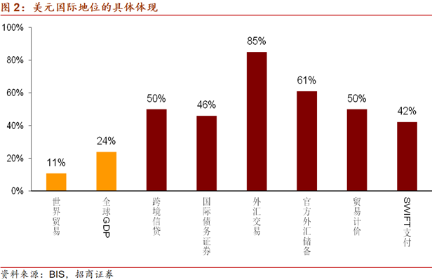 从经济情况来看:美国目前仍是全球第一大经济体,据世界银行数据,2020年美国GDP比重占全球的24.72%(中国为17.37%)。较强的经济实力,是美元霸权的基础。