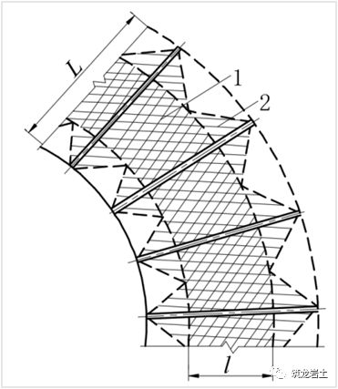 当滑面由单一不连续面控制且岩体较完整时,锚杆间距并不重要,而当岩体较破碎时,锚杆布置应能使岩体内形成一个连续的挤压带。锚头与锚固段之间形成一个约90°的压力锥体,锥体范围内岩石相互挤压,形成一个整体,从而阻止岩体变形。