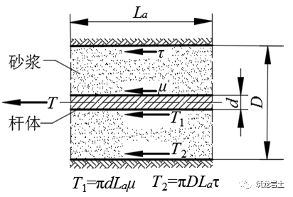 取锚固段为隔离体,当锚固段受力时,拉力首先由杆体周边砂浆的握裹力传递到砂浆中,然后通过锚固段钻孔周边的黏结力(或摩阻力)传递到锚固的地层中