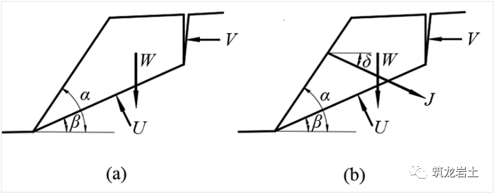 当边坡存在一组出露于坡面的软弱结构面,其走向与坡面走向近似,倾角小于坡面倾角、但大于弱面的内摩擦角,边坡易产生单平面破坏,多出现在岩质边坡中,通常分为坡顶有拉裂缝和无拉裂缝两种情况。但大多数单平面破坏边坡在破坏前坡顶会出现不同程度的拉裂缝。