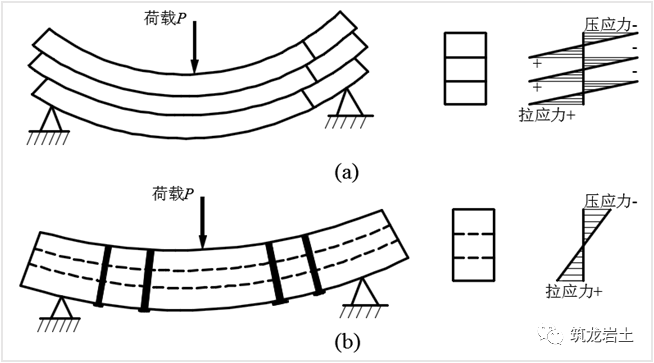把薄层状岩体视为一种梁(简支梁或悬臂梁),在没有锚固时,其只是简单地叠合。