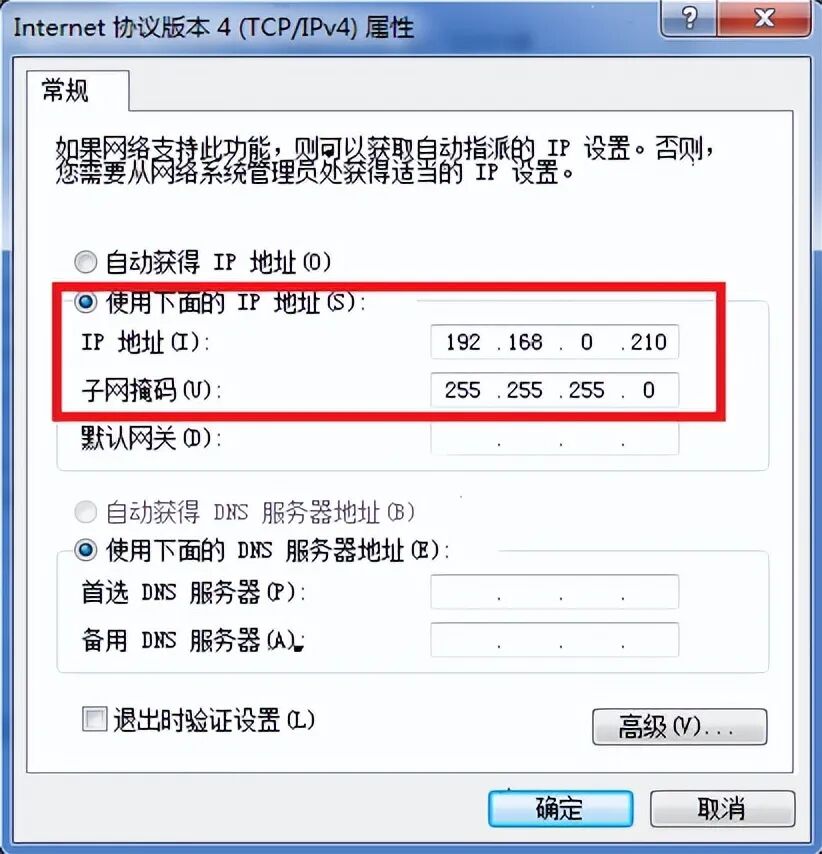 在弹出的Internet 协议4 (TCP/IPv4) 属性对话框中指定IP地址和子网掩码,该IP地址必须和屏的IP地址在一个网段,本例中为192.168.0.210,子网掩码设为255.255.255.0,保存设置。