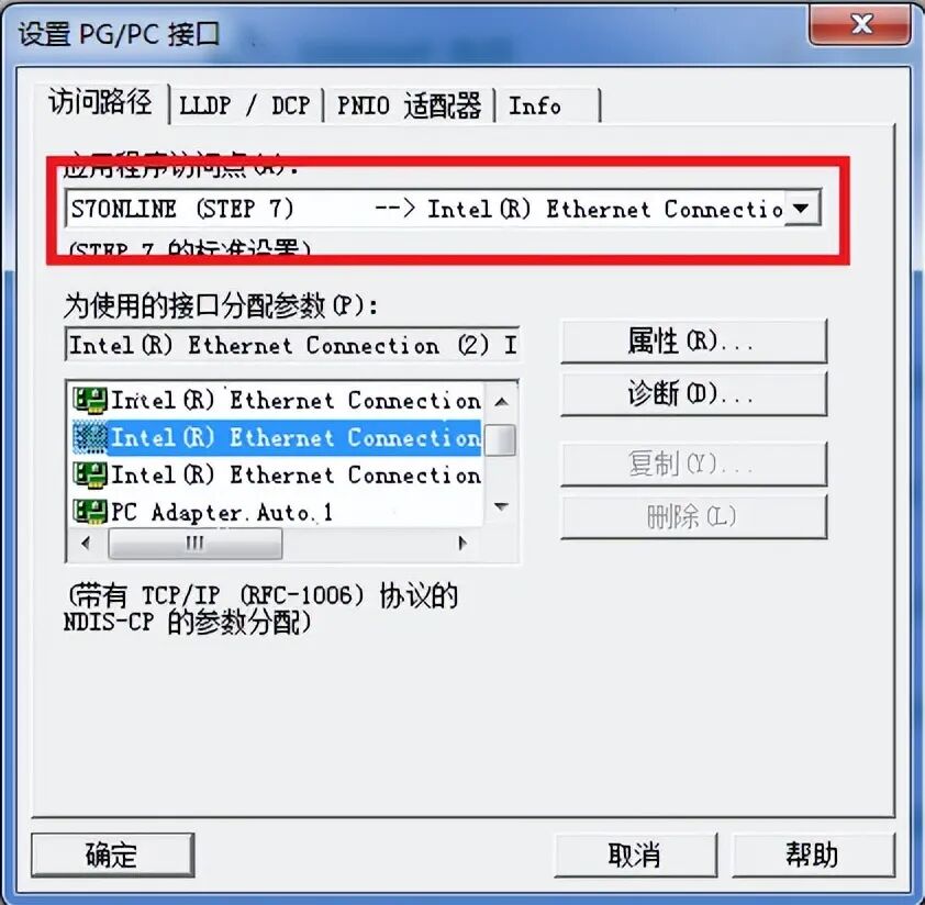 在“Access Point of the Application(应用程序访问点)”的下拉列表中选择 “S7ONLINE (STEP7)”,在 “Interface Parameter Assignment Used (为使用的接口分配参数)”中选择“TCP/IP Intel……”(电脑上使用的那块网卡与屏通讯,就选择那块网卡,不要选择带“Auto”单词的选项。在64位操作系统中,网卡名字后面有 .TCPIP.1的字母)。