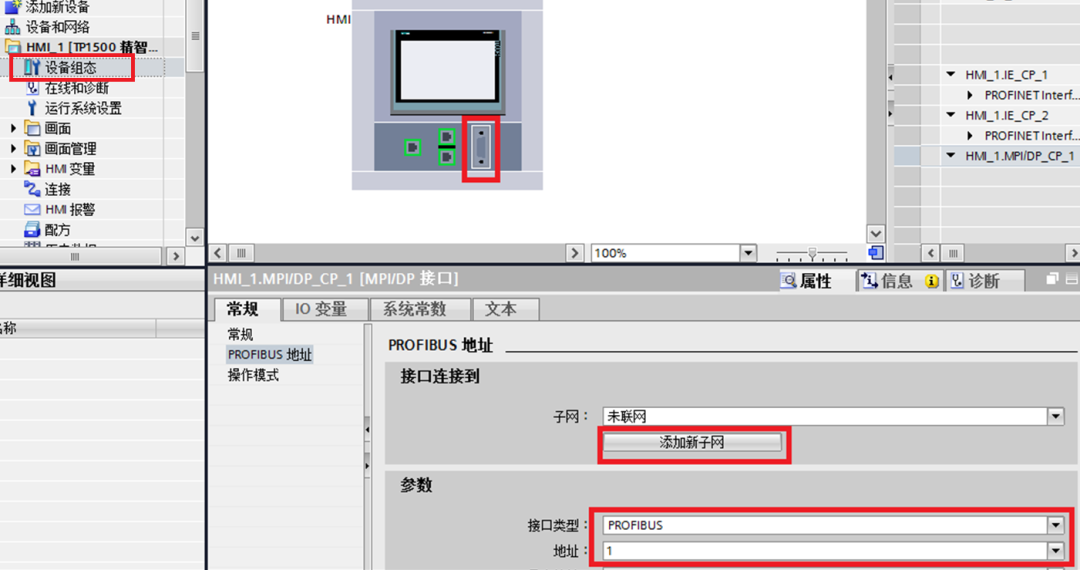 在博途软件中,打开需要下载的项目文件,双击设备组态,选中精智(Comfort)屏的MPI/DP 接口,在属性窗口中,选择接口类型“PROFIBUS”,地址“1”,然后点击添加新子网。