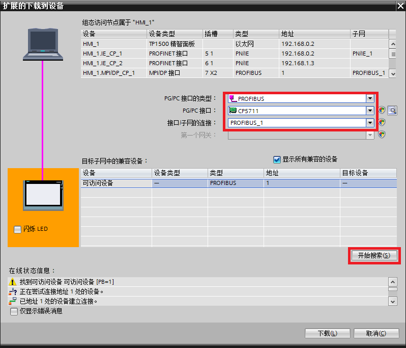 选择 PG/PC 接口的类型为“PROFIBUS”,PG/PC 接口“CP5711”,接口/子网的连接选择之前创建的子网“PROFIBUS_1”,选择完成后,点击开始搜索,软件将以该接口对设备进行扫描,如参数设置及硬件连接正确,将在数秒钟后扫描结束,此时“下载”按钮不是灰色可以选择,单击该按钮进行项目下载,下载预览窗口将会自动弹出。