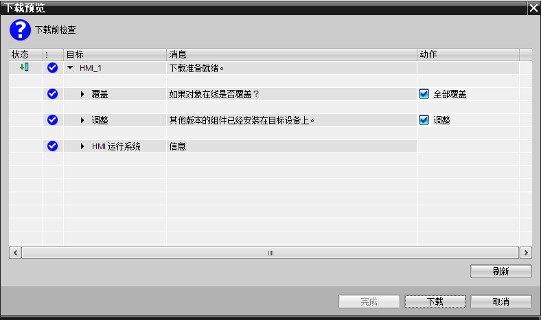 下载之前,软件将会对项目进行编译,只有编译无错后才可进行下载,如发现编译错误请将错误排除后再次进行下载操作。如果项目中有组态用户管理和配方,需要选择“全部覆盖”,然后单击“下载”按钮来完成操作屏的项目下载。