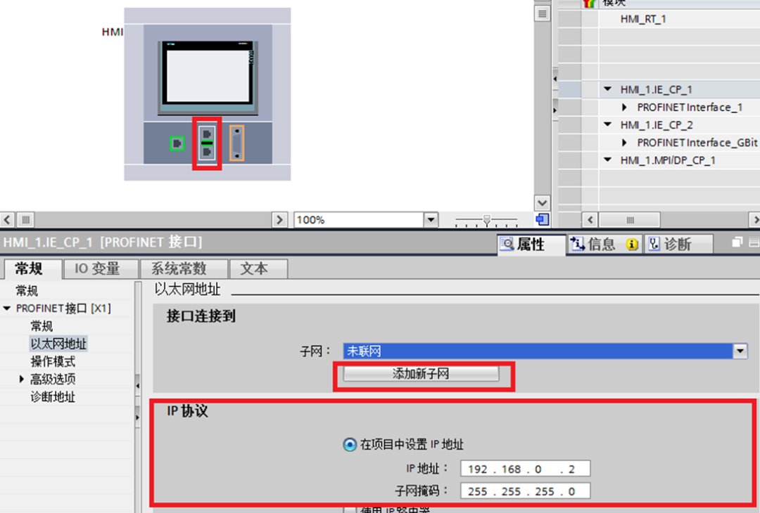 在博途软件中,打开需要下载的项目文件,双击设备组态,选中精智(Comfort)屏的X1以太网口,在属性窗口中,分配IP 地址:192.168.0.2 ,子网掩码:255.255.255.0,然后点击添加新子网。