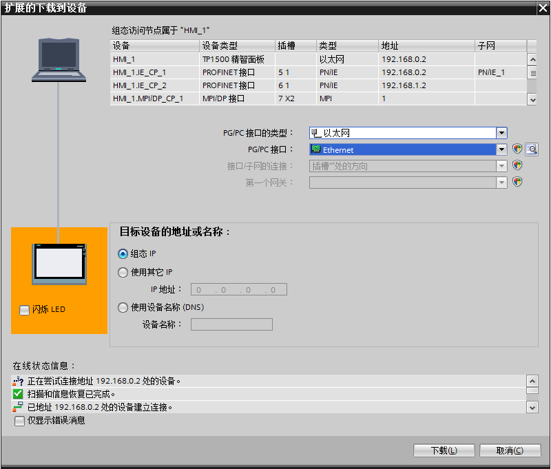 选择 PG/PC 接口的类型“以太网”,PG/PC 接口“Ethernet”,选择完成后,软件将以该接口对项目中所分配的 IP 地址进行扫描,如参数设置及硬件连接正确,将在数秒钟后扫描结束,此时“下载”按钮不是灰色可以选择,单击该按钮进行项目下载,下载预览窗口将会自动弹出。