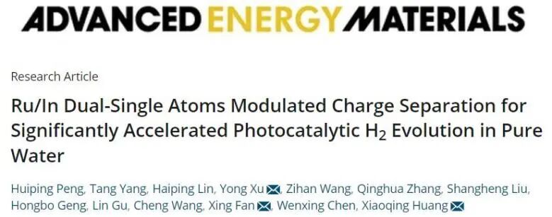 Ru/In Dual-Single Atoms Modulated Charge Separation for Significantly Accelerated Photocatalytic H 2 Evolution in Pure Water. Advanced Energy Materials, 2022. DOI: 10.1002/aenm.202201688
