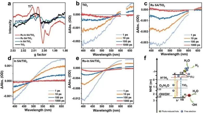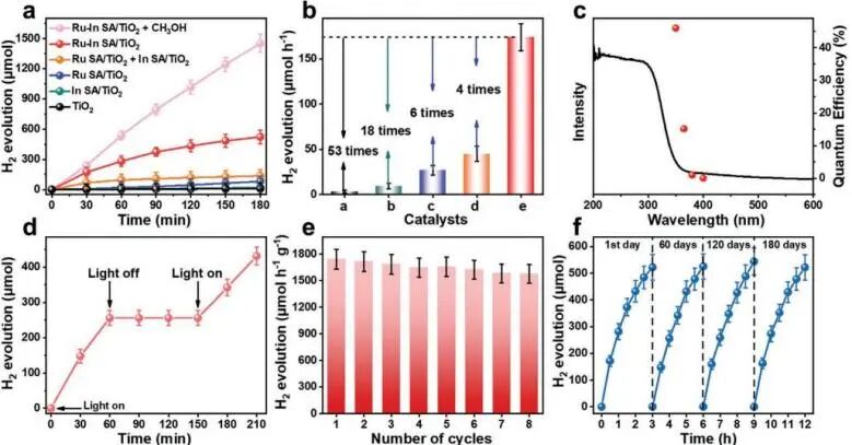 性能测试结果显示,Ru-In SA/TiO 2 的H 2 产率达到174.1µmol h -1 ,分别是Ru单原子(Ru SA/TiO 2 )、单原子(SA/TiO 2 )修饰的TiO 2 的6、18和53倍。此外,连续8个循环后,H 2 生产速率的轻微下降以及Ru-In SA/TiO 2 的形态和结构保留完整,表明Ru-In SA/TiO 2 具有优异的光催化水分解稳定性;Ru-In SA/TiO 2 在不含牺牲剂的海水分解中的H 2 产率为134.8 µmol h -1 ,进一步表明其在光催化水分解中具有潜在的实际应用价值。