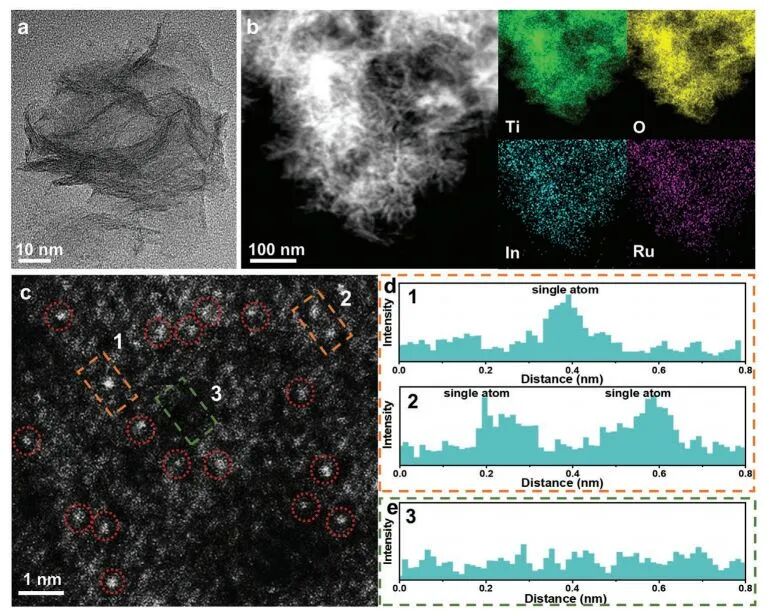 基于此, 厦门大学黄小青 、 苏州大学 樊星 和 广东工业大学徐勇 等利用Ru/In双单原子对超薄TiO 2 纳米片进行修饰(Ru-In SA/TiO 2 ),所制备的光催化剂可以在没有牺牲剂的情况下高效光催化水分解产氢。