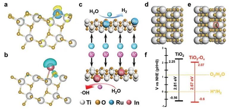 实验结果和理论计算表明,Ru和In双原子被直接取代到TiO 2 中,这种掺杂可以促进O v 的形成,并显著促进光生电子和空穴的分离。具体而言,特别是Ru单原子的掺杂促进光生电子从TiO 2 转移到Ru单原子上,而In单原子的掺杂增强了光生空穴从TiO 2 价带到In单原子的转移,这有利于电子-空穴对的分离和抑制随后的复合。总的来说,这项工作不仅证明了在没有牺牲剂的情况下高效水分解的可行性,而且为光催化等领域的催化剂设计提供了新的策略。